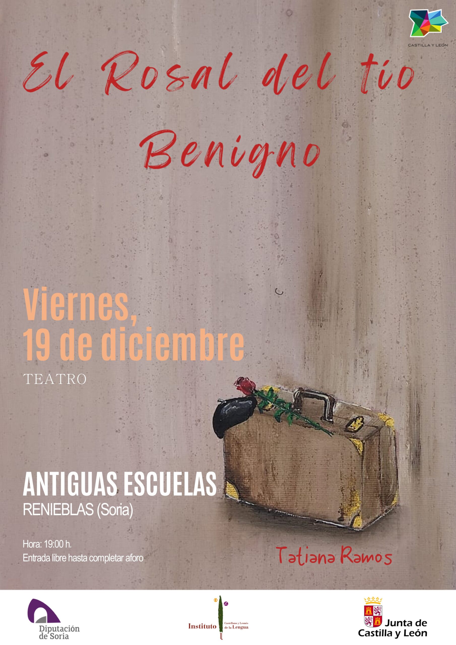 El Instituto Castellano y Leonés de la Lengua y la Diputación de Soria programan el viernes, 19 de diciembre, a las 19:00 horas, en el pequeño municipio soriano de Renieblas, la propuesta de microteatro ‘El rosal del tío Benigno’, puesta en escena de la compañía ‘Pasito a paso’, de la actriz soriana Tatiana Ramos. Se trata […]