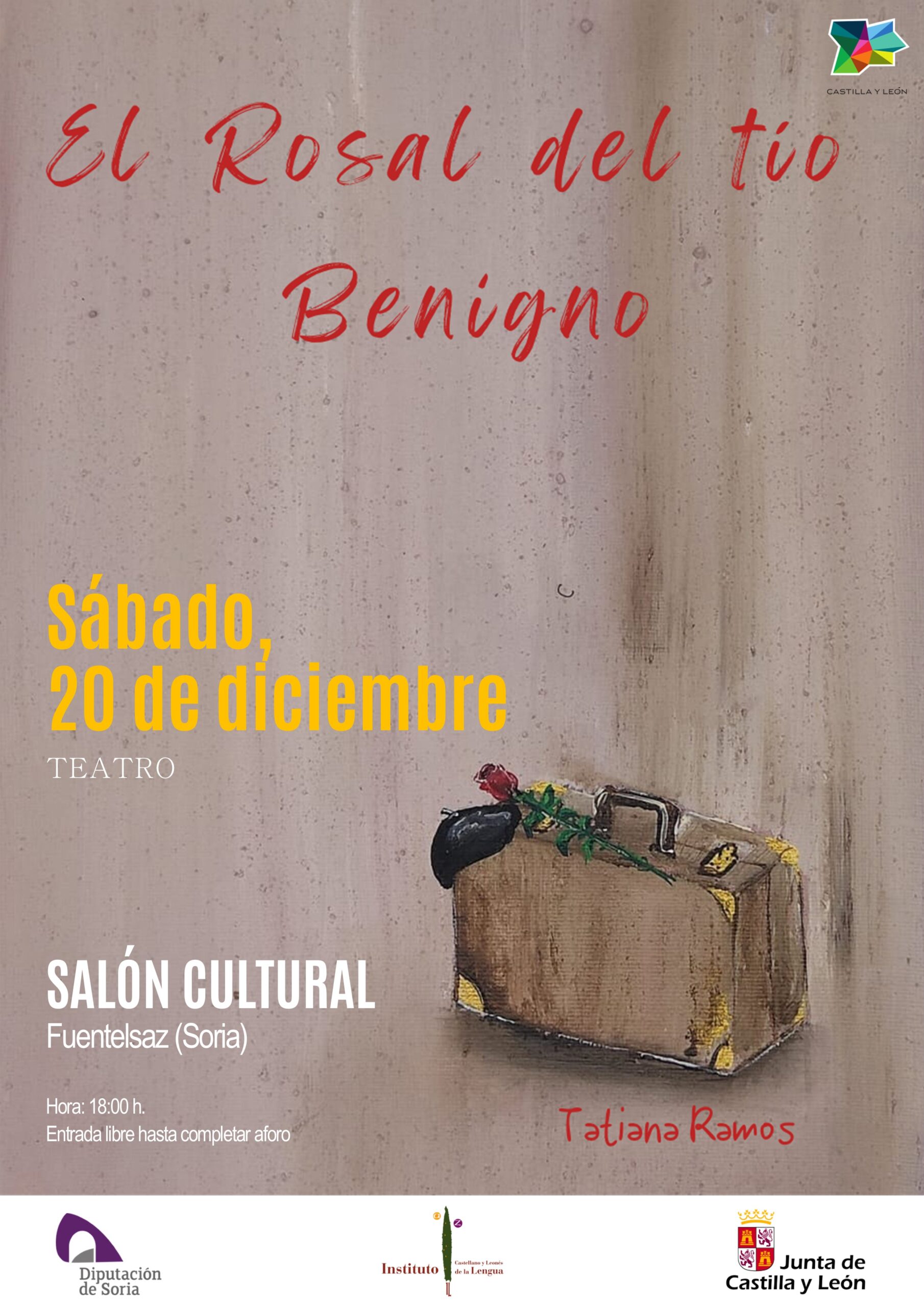El Instituto Castellano y Leonés de la Lengua y la Diputación de Soria programan el sábado, 20 de diciembre, a las 18:00 horas, en el pequeño municipio soriano de Fuentelsaz, la propuesta de microteatro ‘El rosal del tío Benigno’, puesta en escena de la compañía ‘Pasito a paso’, de la actriz soriana Tatiana Ramos. Se trata […]