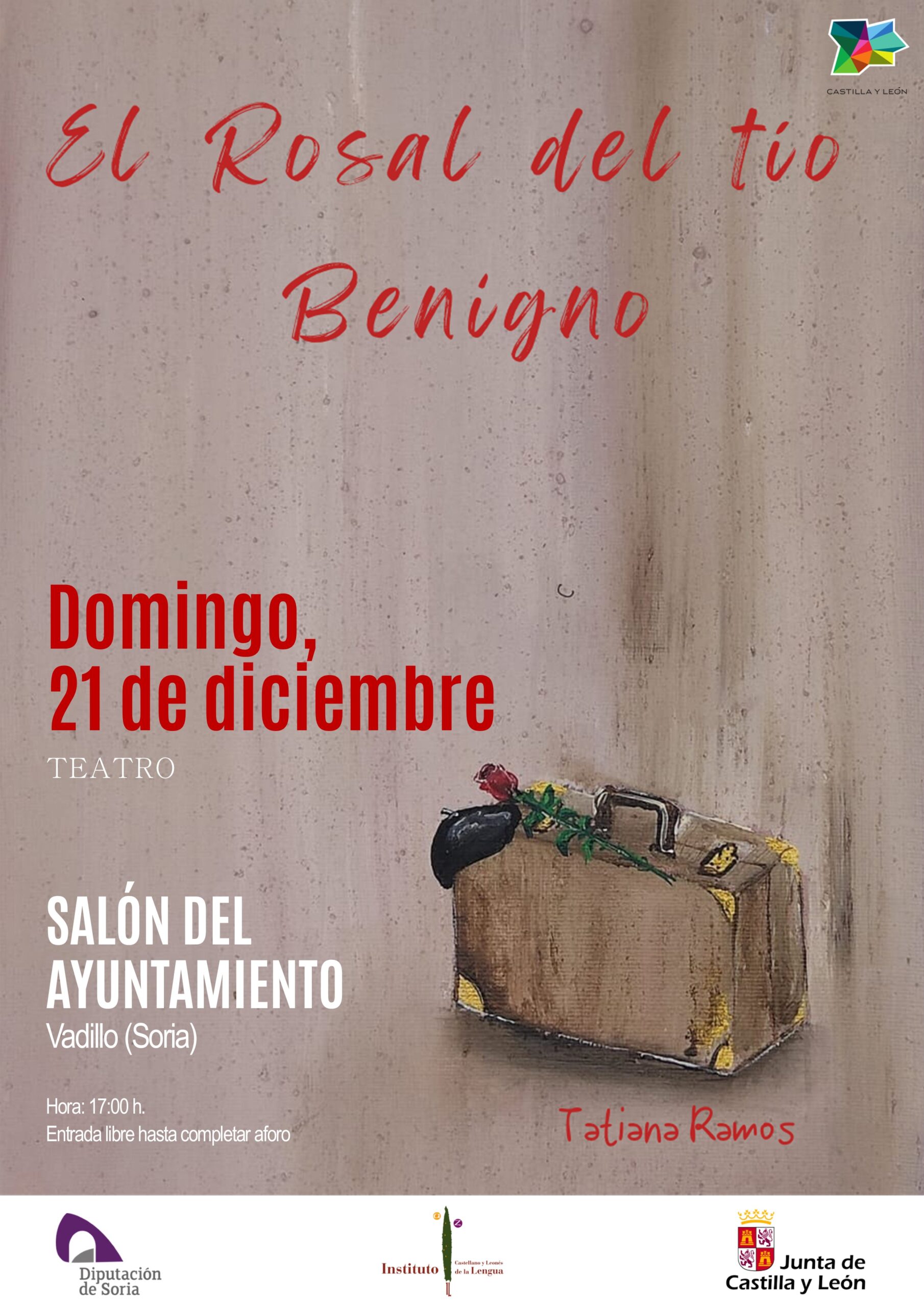El Instituto Castellano y Leonés de la Lengua y la Diputación de Soria programan el domingo, 21 de diciembre, a las 17:00 horas, en el pequeño municipio soriano de Vadillo, la propuesta de microteatro ‘El rosal del tío Benigno’, puesta en escena de la compañía ‘Pasito a paso’, de la actriz soriana Tatiana Ramos. Se trata […]
