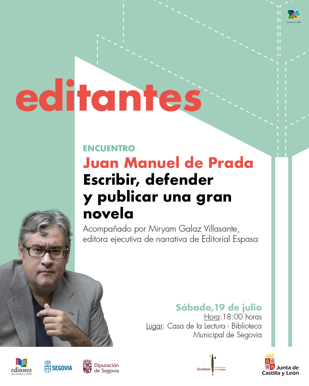 El escritor Juan Manuel de Prada participa el sábado, 19 de julio, a las 18:00 horas, en la Casa de la Lectura- Biblioteca municipal de Segovia, en el encuentro ‘Escribir, defender y publicar una gran novela’. Se trata de una propuesta complementaria que se integra en la programación de la II Feria de Editores de Castilla y León ‘Editantes’ que el Ayuntamiento de Segovia y el Instituto Castellano y Leonés de la Lengua promueven junto al Gremio de Editores de Castilla y León en la Plaza Mayor de la capital segoviana desde el 17 al 20 de julio.