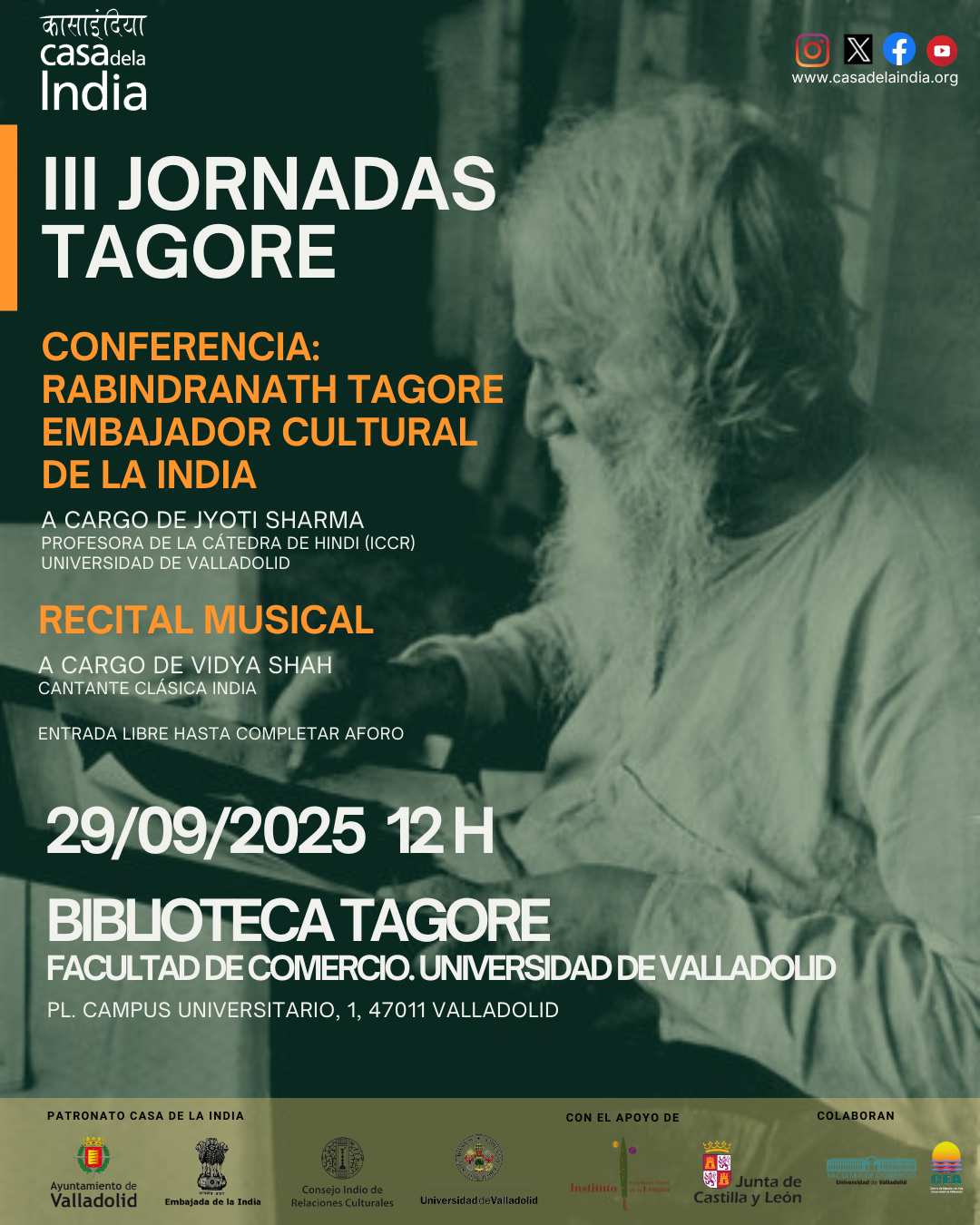 La Casa de la India de Valladolid promueve junto al Instituto Castellano y Leonés de la Lengua las ‘III Jornadas Tagore’ en la capital vallisoletana con la organización en la Biblioteca Tagore de la Facultad de Comercio de la Universidad de Valladolid, de la conferencia ‘Rabindranath Tagore embajador cultural de la India’ que imparte el lunes, 29 de septiembre, a las 12:00 horas, Jyoti Sharma, profesora de la cátedra de Hindi (ICCR) de la Universidad de Valladolid.