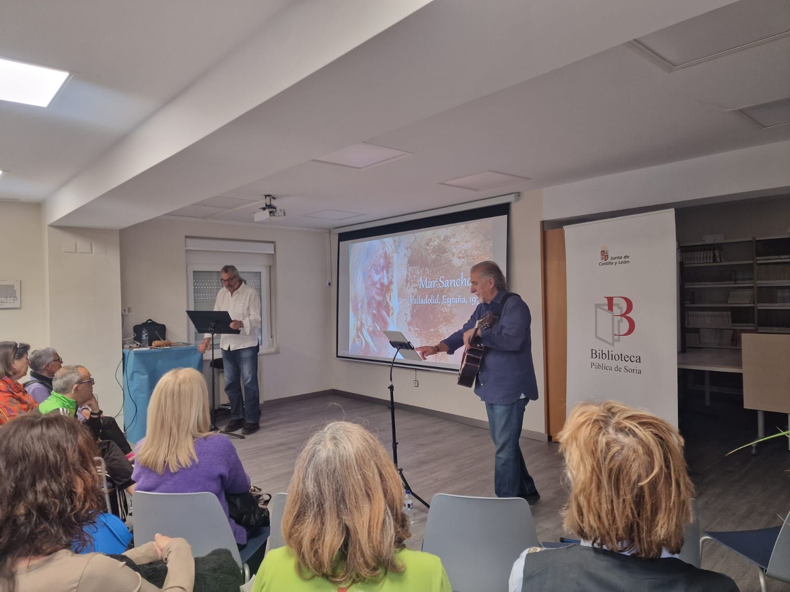 El Ayuntamiento de Soria y el Instituto Castellano y Leonés de la Lengua organizaron el jueves, 15 de mayo, a las 19:30 horas, en la Biblioteca Pública de Soria, el espectáculo ‘12 sones para 12 poetas’, actividad músico-literaria desarrollada por el hispanista Tony Geist y el músico y filólogo Paco Díez. Se trata de un proyecto novedoso y único que ofrece la sonorización de una docena de poemas a cargo de Tony Geist, que han sido musicados para ser cantados por Paco Díez.
