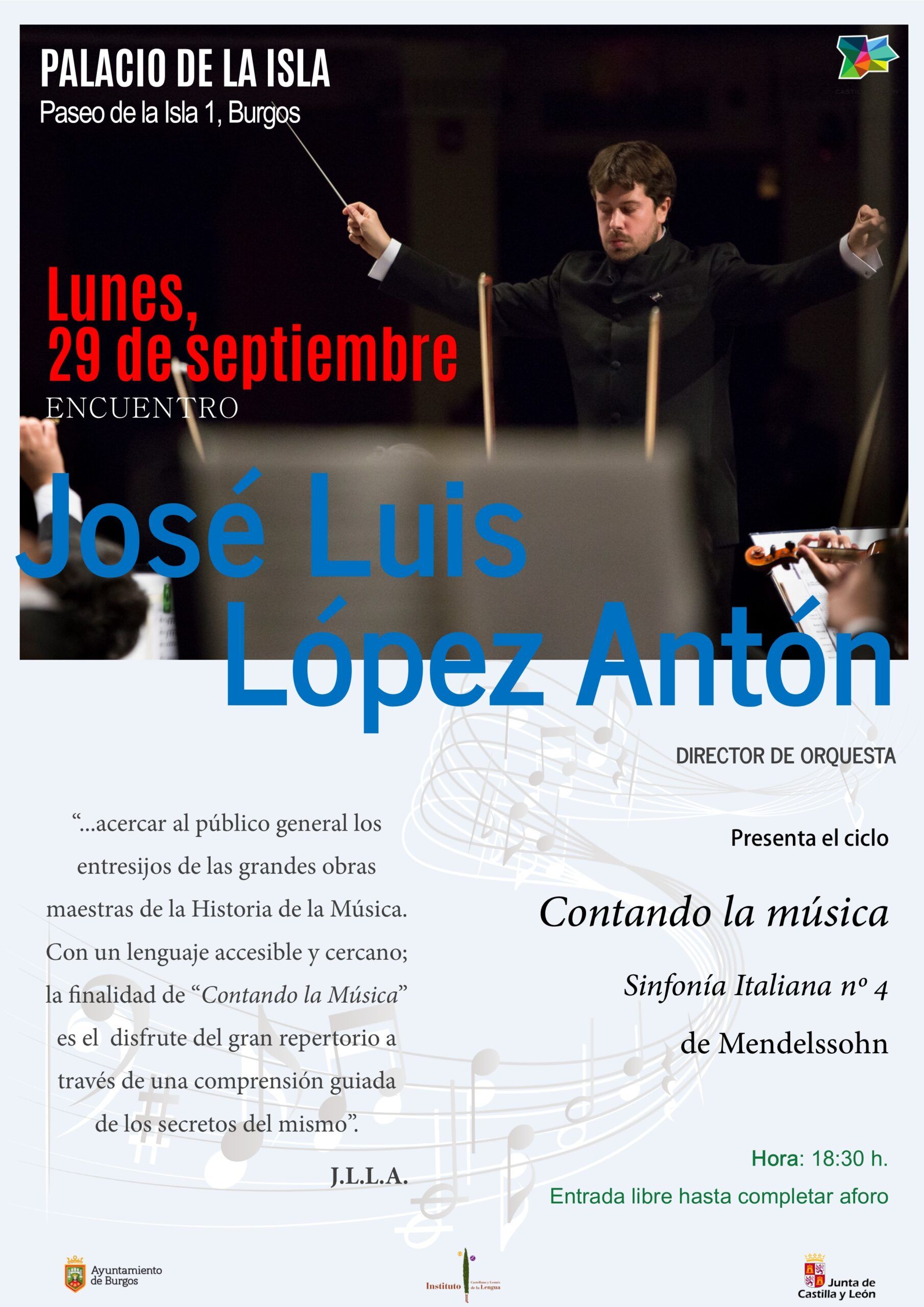 El Instituto Castellano y Leonés de la Lengua organiza el lunes, 29 de septiembre, a las 18:30 horas, en el Palacio de la Isla de Burgos, una nueva sesión de ‘Contando la música’, la charla de apreciación musical que imparte José Luis López Antón, director de la Orquesta Sinfónica de Ávila. En este encuentro con la música clásica, analizará la Sinfonía n.º 4 en La mayor, Op. 90, Italiana, de Félix Mendelssohn, compuesta entre 1830 y 1833 e inspirada en el viaje que el compositor realizó por Italia años antes.