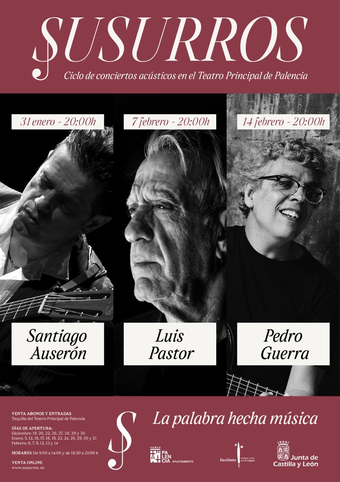 El Instituto Castellano y Leonés de la Lengua y el Ayuntamiento de Palencia programan en el Teatro Principal de la capital palentina el nuevo ciclo de conciertos ‘Susurros, la palabra hecha música’, una propuesta musical que reivindica la esencia de la canción de autor y la fuerza expresiva de la palabra cantada. Concebido como un espacio de escucha atenta y proximidad, el ciclo ofrece tres conciertos acústicos que están protagonizados por algunas de las voces más destacadas del panorama musical en español.