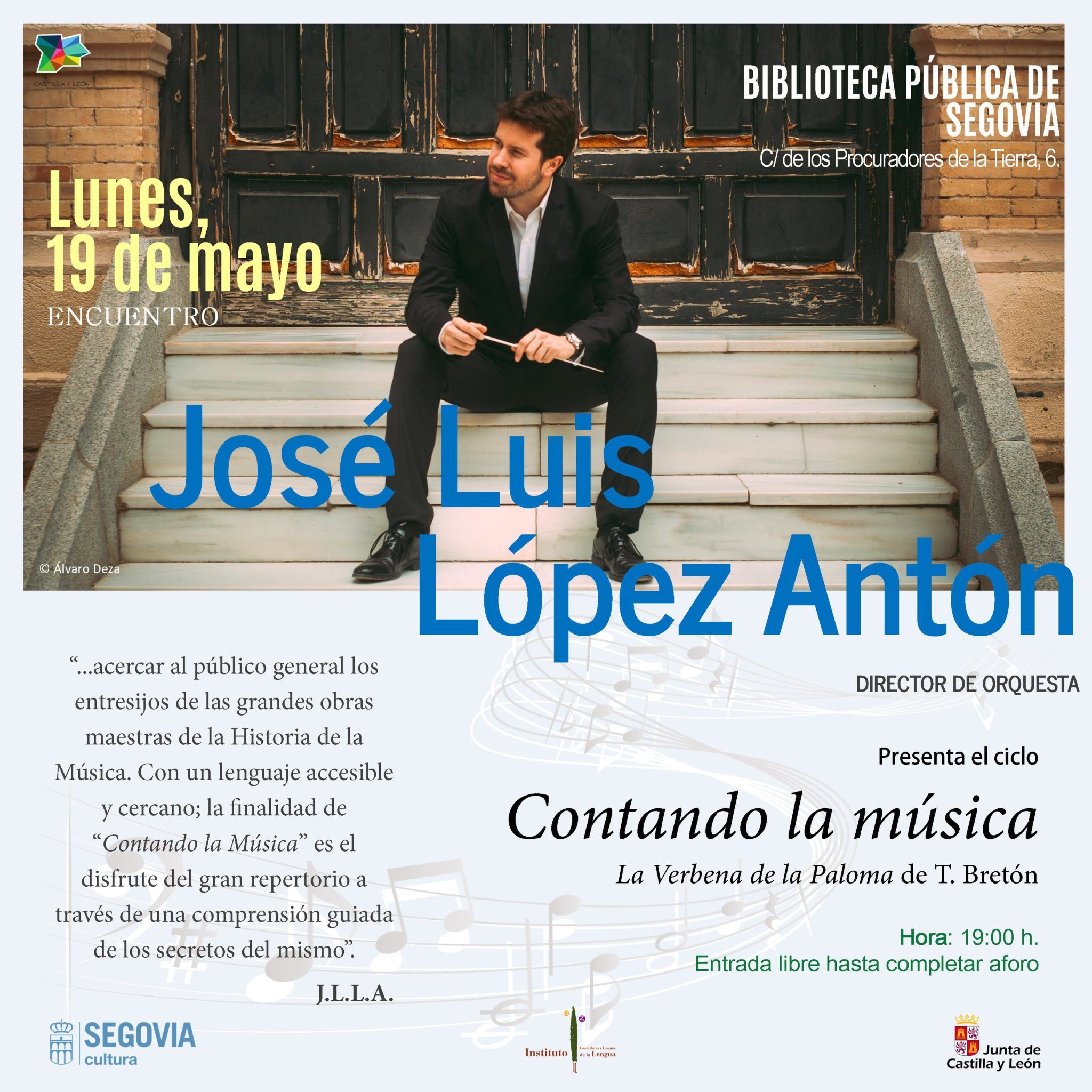 El Instituto Castellano y Leonés de la Lengua y el Ayuntamiento de Segovia organizan hoy lunes, 19 de mayo, a las 19:00 horas, en la Biblioteca Pública de Segovia, una sesión de ‘Contando la música’, la charla de apreciación musical que imparte José Luis López Antón, director titular de la Orquesta Sinfónica de Ávila. En este encuentro con el público segoviano, López Antón se centrará en la popular ‘Verbena de la Paloma’, subtitulada El boticario y las chulapas y celos mal reprimidos, sainete lírico en prosa con libreto de Ricardo de la Vega y música de Tomás Bretón, estrenado el 17 de febrero...