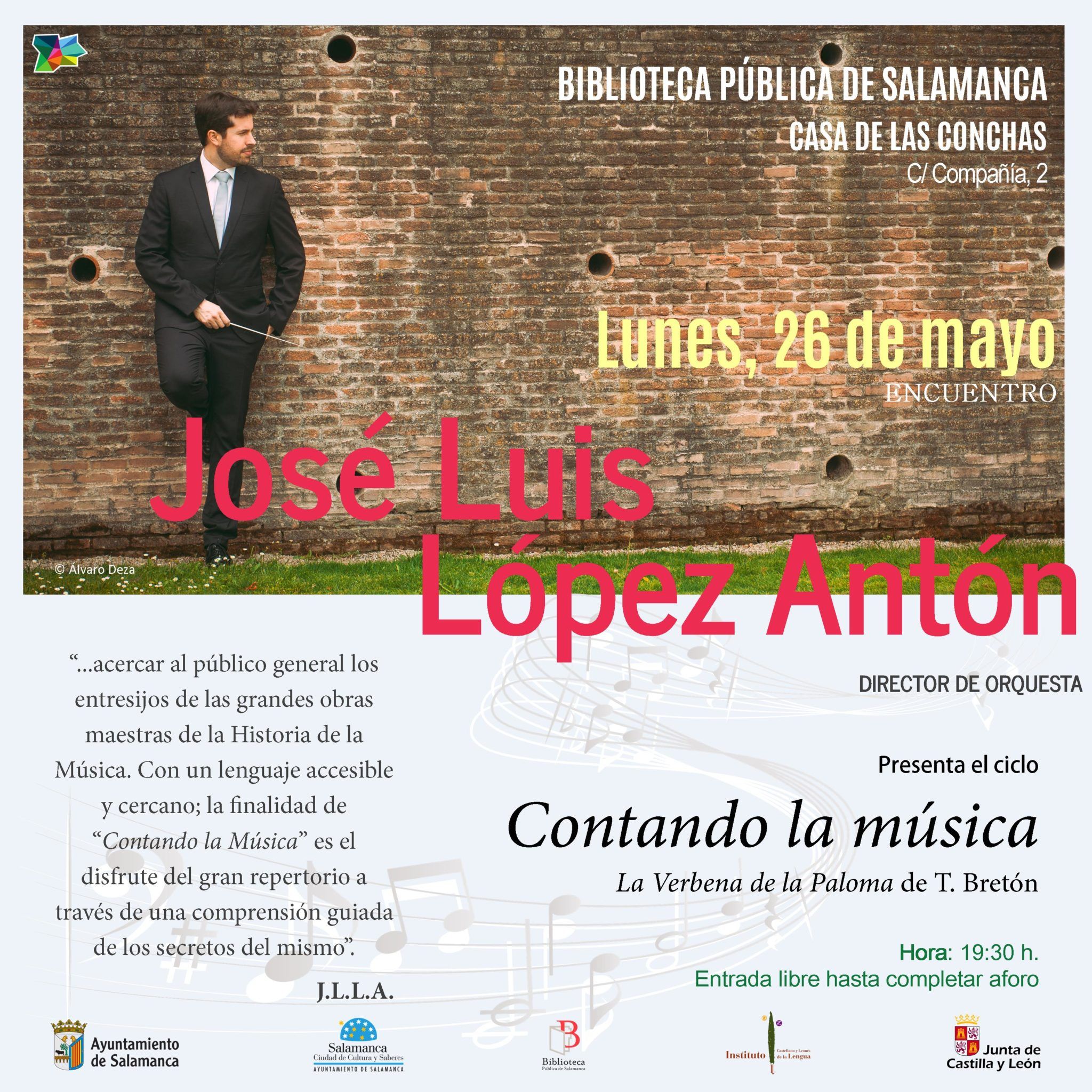 El Instituto Castellano y Leonés de la Lengua y el Ayuntamiento de Salamanca organizan el lunes, 26 de mayo, a las 19:30 horas, en la Biblioteca Pública de Salamanca Casa de las Conchas, una nueva sesión de ‘Contando la música’, la charla de apreciación musical impartida por José Luis López Antón, director titular de la Orquesta Sinfónica de Ávila. En este encuentro nuevo con el público salmantino, López Antón se centrará en la popular ‘Verbena de la Paloma’, subtitulada El boticario y las chulapas y celos mal reprimidos, sainete lírico en prosa con libreto de Ricardo de la Vega y música de...