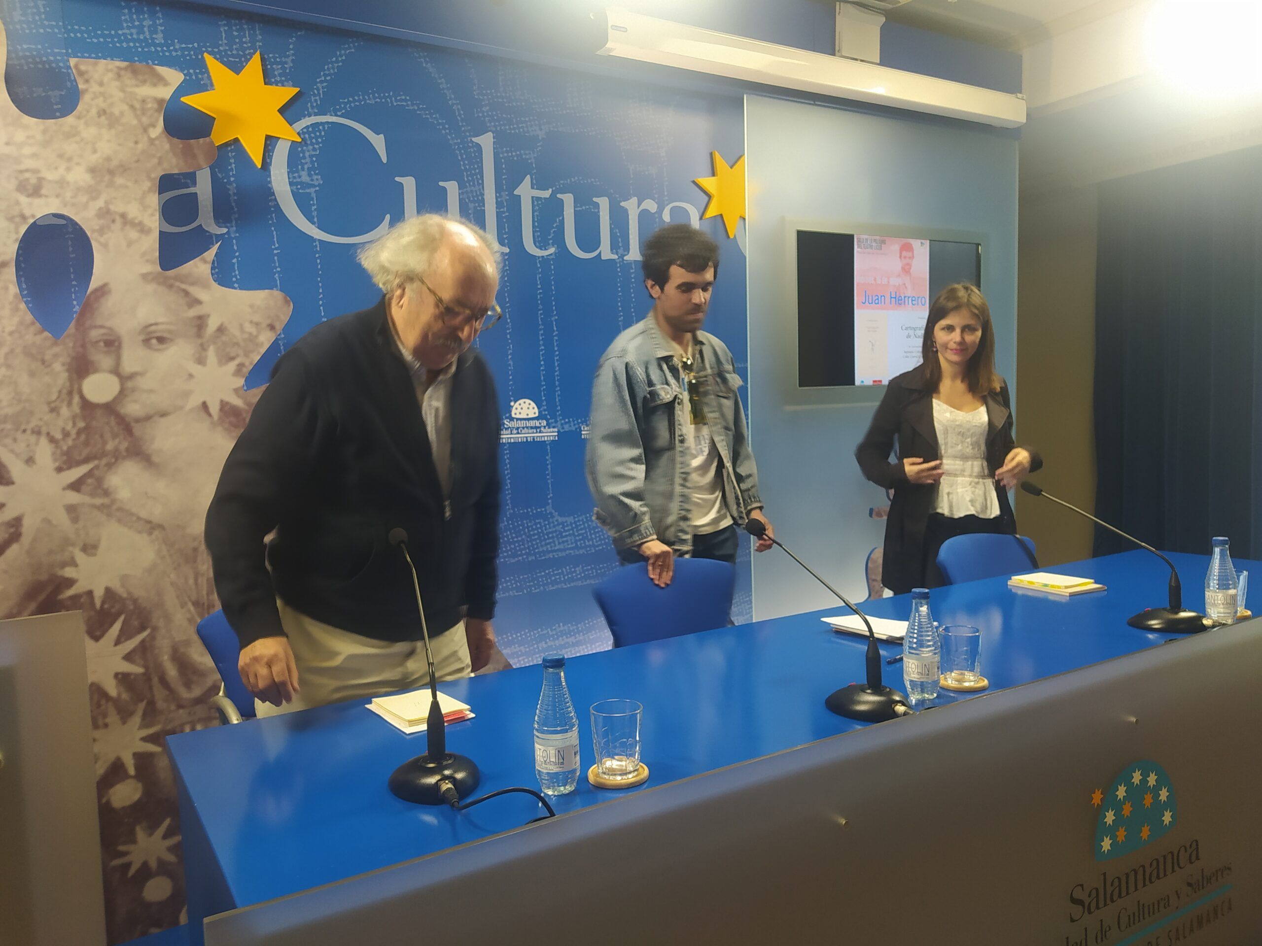El Ayuntamiento de Salamanca y el Instituto Castellano y Leonés de la Lengua han organizado el viernes, 16 de mayo en la Sala de la Palabra del Teatro Liceo de Salamanca, la presentación del poemario Cartografía de Nadie (Ediciones Rialp), del poeta vallisoletano Juan Herrero, ganador del Premio Adonáis de Poesía 2024 que convoca esta editorial para reconocer a poetas en lengua española menores de 35 años. El autor, que ha estado acompañado durante esta presentación por los poetas Antonio Colinas y Celia Corral Cañas, ha leído en público algunos versos del poemario premiado.