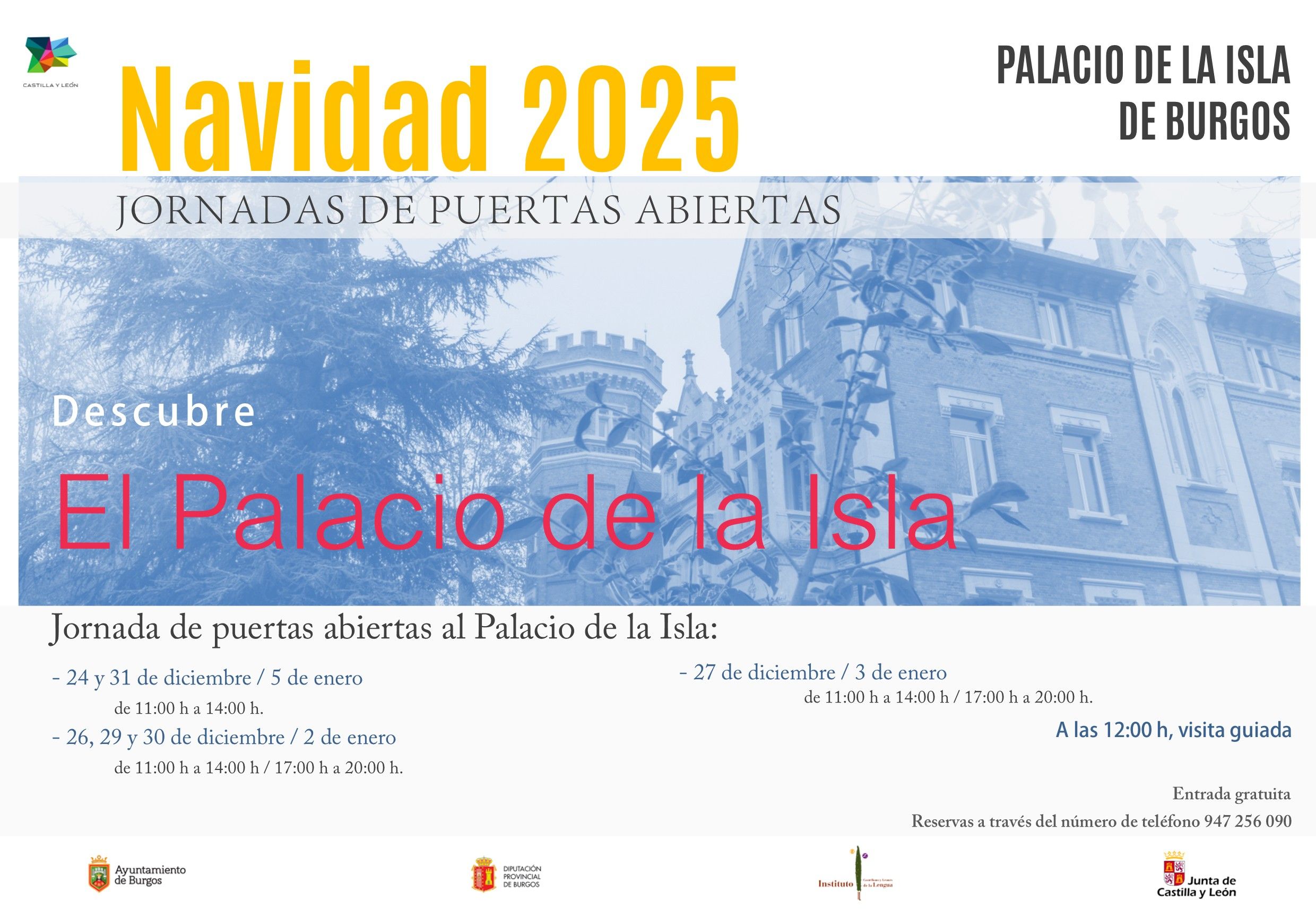El Instituto Castellano y Leonés de la Lengua programa en Navidades nuevas jornadas de puertas abiertas a su sede, el Palacio de la Isla de Burgos, con un horario especial ampliado y manteniendo los sábados (27 de diciembre y 3 de enero) las visitas guiadas gratuitas programadas al inmueble. Con esta propuesta divulgativa, la institución quiere dar a conocer la abundante historia de este edificio emblemático de la capital burgalesa y presentar también el trabajo que realiza en el ámbito de la investigación de los orígenes del español y de divulgación de la literatura de Castilla y León.