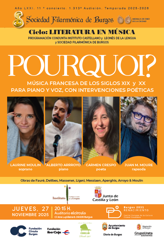 El Instituto Castellano y Leonés de la Lengua y la Sociedad Filarmónica de Burgos programan el jueves, 27 de noviembre, a las 20:15 horas, en el Auditorio ElCirculo de la capital burgalesa, la segunda de las tres actuaciones conjuntas del nuevo ciclo ‘Literatura en Música’, desarrollado conjuntamente por ambas instituciones en el marco de la nueva temporada musical 2025/26 que promueve la Sociedad Filarmónica de Burgos.