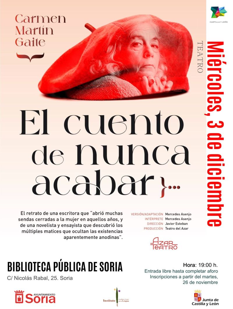 El Instituto Castellano y Leonés de la Lengua y el Ayuntamiento de Soria organizan el miércoles, 3 de diciembre a las 19:00 horas, en la Biblioteca Pública de la capital soriana la puesta en escena de la obra teatral ‘El cuento de nunca acabar’, de la compañía Azar Teatro. La obra constituye un retrato de la escritora Carmen Martín Gaite, autora que abrió muchas sendas cerradas a la mujer y que, con su trabajo literario, fue capaz de descubrir las múltiples facetas que permanecen ocultas tras existencias aparentemente anodinas. El estreno se enmarca en los actos programados por la conmemoración institucional del centenario de la autora salmantina.