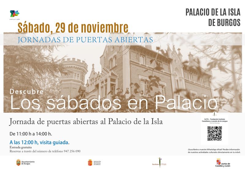 El Instituto Castellano y Leonés de la Lengua organiza el sábado, 29 de noviembre, en horario de 11:00 a 14:00 horas, ‘Los Sábados en Palacio’, una jornada de puertas abiertas a su sede, el Palacio de la Isla de Burgos, que incluye una visita guiada gratuita (12:00 horas) que acerca al visitante la historia de uno de los inmuebles con más historia de la capital burgalesa. Esta propuesta divulgativa quiere servir para dar a conocer el trabajo de la institución en el ámbito de la investigación de orígenes del español y en la promoción de la literatura de la Comunidad.