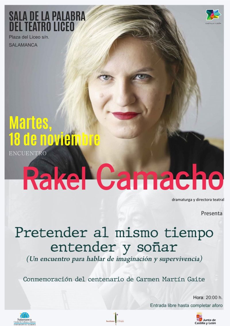El Ayuntamiento de Salamanca y el Instituto Castellano y Leonés de la Lengua organizan el martes, 18 de noviembre, a las 20.00 horas, en la Sala de la Palabra del Teatro Liceo, la conferencia Pretender al mismo tiempo entender y soñar (Un encuentro para hablar de imaginación y supervivencia), impartida por la dramaturga y directora teatral Rakel Camacho. La invitada ha dirigido a la compañía Teatro de la Abadía en la puesta en escena de la obra de teatro El cuarto de atrás, original de la escritora salmantina Carmen Martín Gaite, autora de la que se conmemora en 2025 su centenario con distintas actividades.