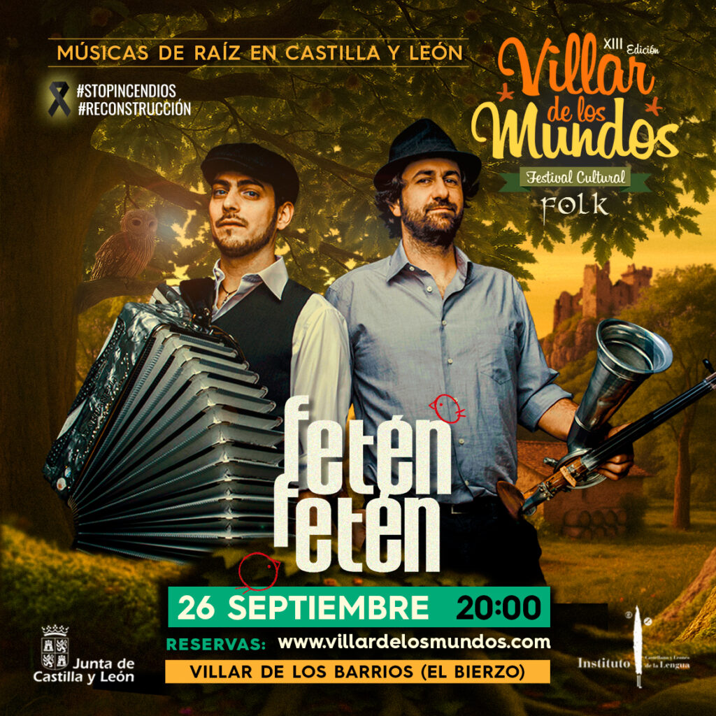 La XIII edición del Festival Villar de los Mundos rinde homenaje al folclore y las músicas de raíz de Castilla y León. En este sentido, el viernes 26 de septiembre a las 20:00, el público tiene una cita con el grupo burgalés Fetén Fetén. Diego Galaz y Jorge Arribas no son solamente un dúo, sino también una verbena portátil, un torbellino de imaginación y virtuosismo. En sus manos, un serrucho llora un vals, una silla de camping se convierte en flauta y un violín trompeta te hace bailar sin remedio. Son los luthiers de la España vaciada, capaces de extraer melodías de los objetos más inesperados para recordar al público que la alegría y la belleza se esconden en los lugares más sencillos.