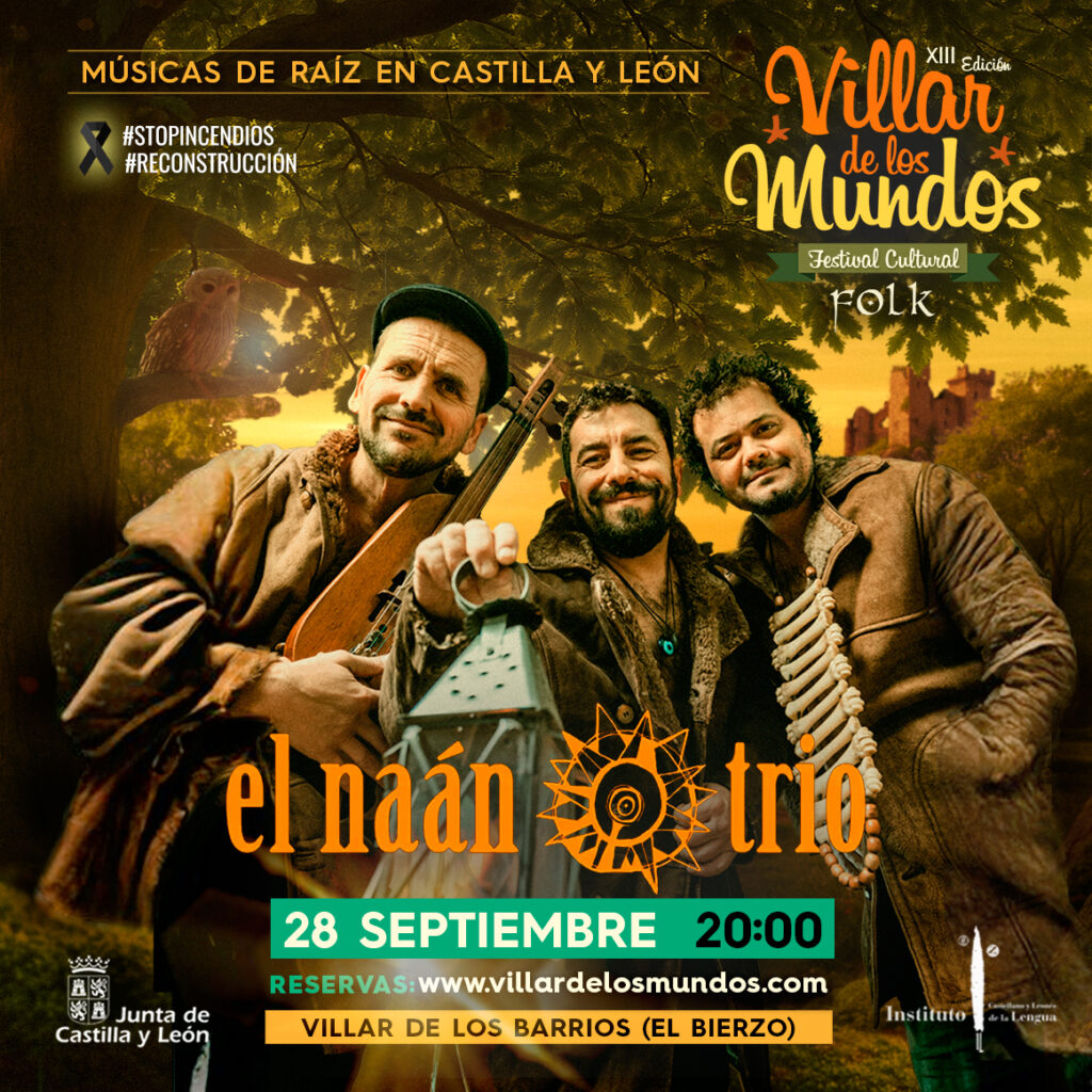 La segunda cita con la música folk que aapdrina el Instituto Castellano y Leonés de la Lengua está prevista el domingo 28 de septiembre a las 20:00 horas. El palentino El Naán Trío acude con un sonido ancestral y futurista de los tres pilares de una gran banda de folk reconocida en todo el continente europeo. La poesía afilada de Héctor Castrillejo, la maestría multi-instrumental y la voz profunda de Carlos Herrero, y la percusión atávica y precisa de Adal Pumarabín exploran la raíz étnica de la tradición ibérica desde su núcleo, despojándola de todo artificio para mostrar su esqueleto sonoro. Su propuesta es un viaje a lo esencial, con instrumentos campesinos y versos que arañan el alma.