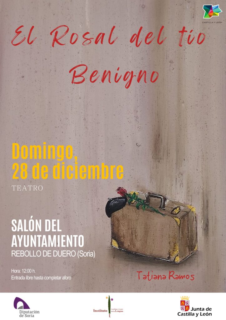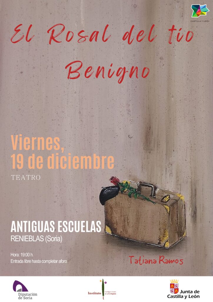 La Diputación de Soria y el Instituto Castellano y Leonés de la Lengua programan durante las próximas semanas en las localidades sorianas de Almaluez, Cihuela, Renieblas, Fuentelsaz, Muriel Viejo, Vadillo, Miño de San Esteban y Rebollo de Duero la representación de ‘El Rosal del Tío Benigno’, puesta en escena de microteatro de la compañía ‘Pasito a paso’, dirigida por la actriz soriana Tatiana Ramos.