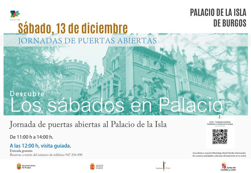 El Instituto Castellano y Leonés de la Lengua organiza el sábado, 13 de diciembre, en horario de 11:00 a 14:00 horas, ‘Los Sábados en Palacio’, una jornada de puertas abiertas a su sede. el Palacio de la Isla de Burgos, que incluye una visita guiada (12:00 horas, gratuita) que acerca al visitante la historia de uno de los edificios más emblemáticos de la ciudad. Esta propuesta quiere servir para dar a conocer el trabajo de la institución en el ámbito de la investigación de orígenes del español y en la promoción de la literatura de la Comunidad.