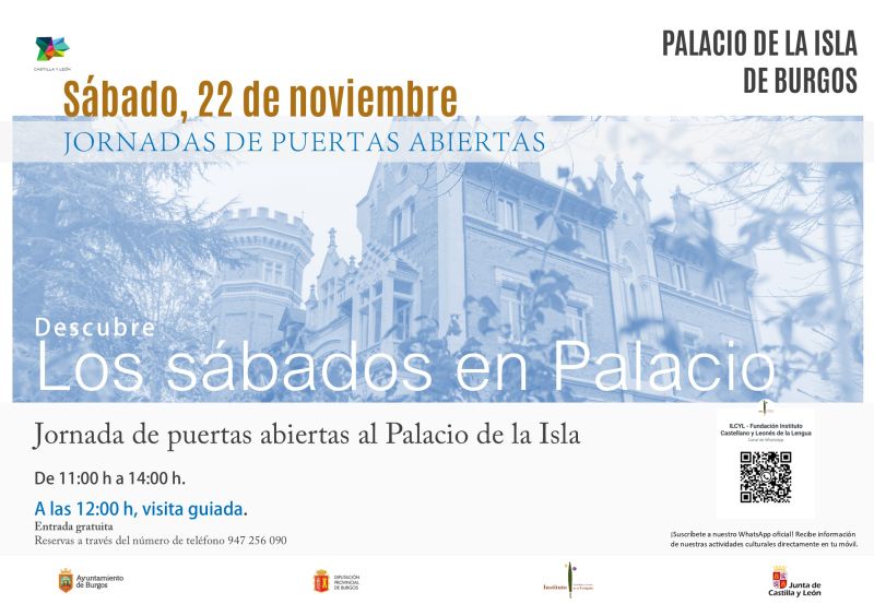 El Instituto Castellano y Leonés de la Lengua organiza el sábado, 22 de noviembre, en horario de 11:00 a 14:00 horas, ‘Los Sábados en Palacio’, una jornada de puertas abiertas a su sede, el Palacio de la Isla de Burgos, que incluye una visita guiada (12:00 horas) gratuita que acerca al visitante la historia de uno de los edificios más emblemáticos de la ciudad. Esta propuesta quiere servir para dar a conocer el trabajo de la institución en el ámbito de la investigación de orígenes del español y en la promoción de la literatura de la Comunidad.