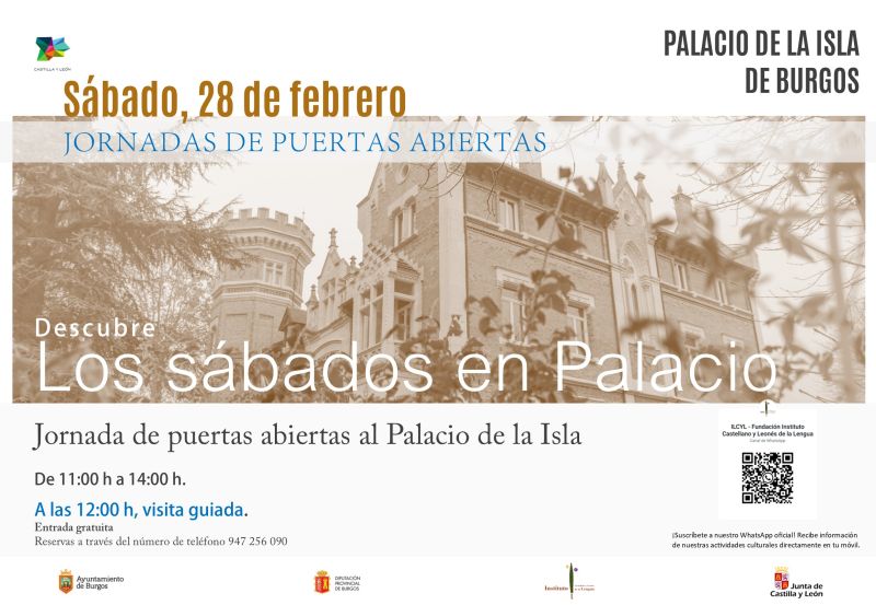 El Instituto Castellano y Leonés de la Lengua organiza el sábado, 28 de febrero, en horario de 11:00 a 14:00 horas, una nueva sesión de ‘Los Sábados en Palacio’, la jornada de puertas abiertas que permite conocer tanto la abundante historia que rodea al Palacio de la Isla de Burgos como el trabajo que esta institución realiza en el ámbito de la investigación de los orígenes del español y de la promoción de la literatura de Castilla y León. La programación de una visita guiada gratuita a las 12:00 horas permite conocer a fondo el inmueble y el trabajo que desarrolla la institución