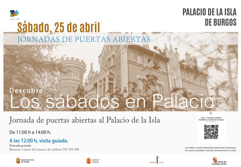 El Instituto Castellano y Leonés de la Lengua organiza el sábado, 25 de abril, en horario de 11:00 a 14:00 horas, una nueva sesión de ‘Los Sábados en Palacio’, jornada de puertas abiertas que permite al visitante conocer tanto la abundante historia que rodea al Palacio de la Isla de Burgos como el trabajo que esta institución realiza en el ámbito de la investigación de los orígenes del español y la promoción de la literatura de Castilla y León. La programación incluye una visita guiada gratuita a las 12:00 horas con reserva previa.
