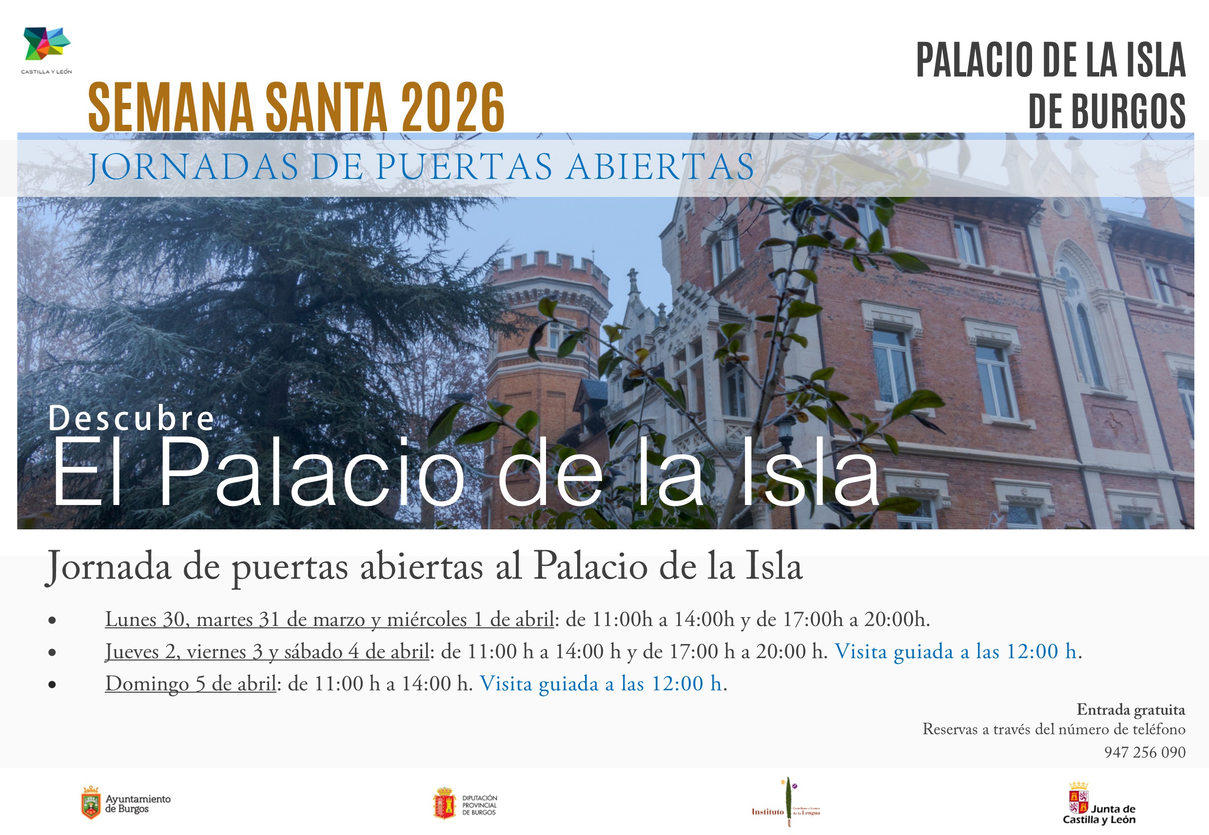 El Instituto Castellano y Leonés de la Lengua organiza durante todos los días de Semana Santa (2, 3, 4 y 5 de abril) jornadas de puertas abiertas al Palacio de la Isla de Burgos con la programación de visitas guiadas a estas instalaciones que permiten conocer la historia de un inmueble que ha tenido a lo largo de sus 140 años de historia numerosos usos e inquilinos. Con la intención de atender a visitantes y turistas que visitan el edificio coincidiendo con estas fechas festivas, la institución abre al público desde el lunes,30 de marzo hasta el sábado 4 de abril, entre las 11:00 y las 14:00 horas y amplía su horario de tarde, que será de 17:00 y las 20:00 horas.  El domingo, 5 de abril, el horario de apertura es de 11:00 a 14.00 horas