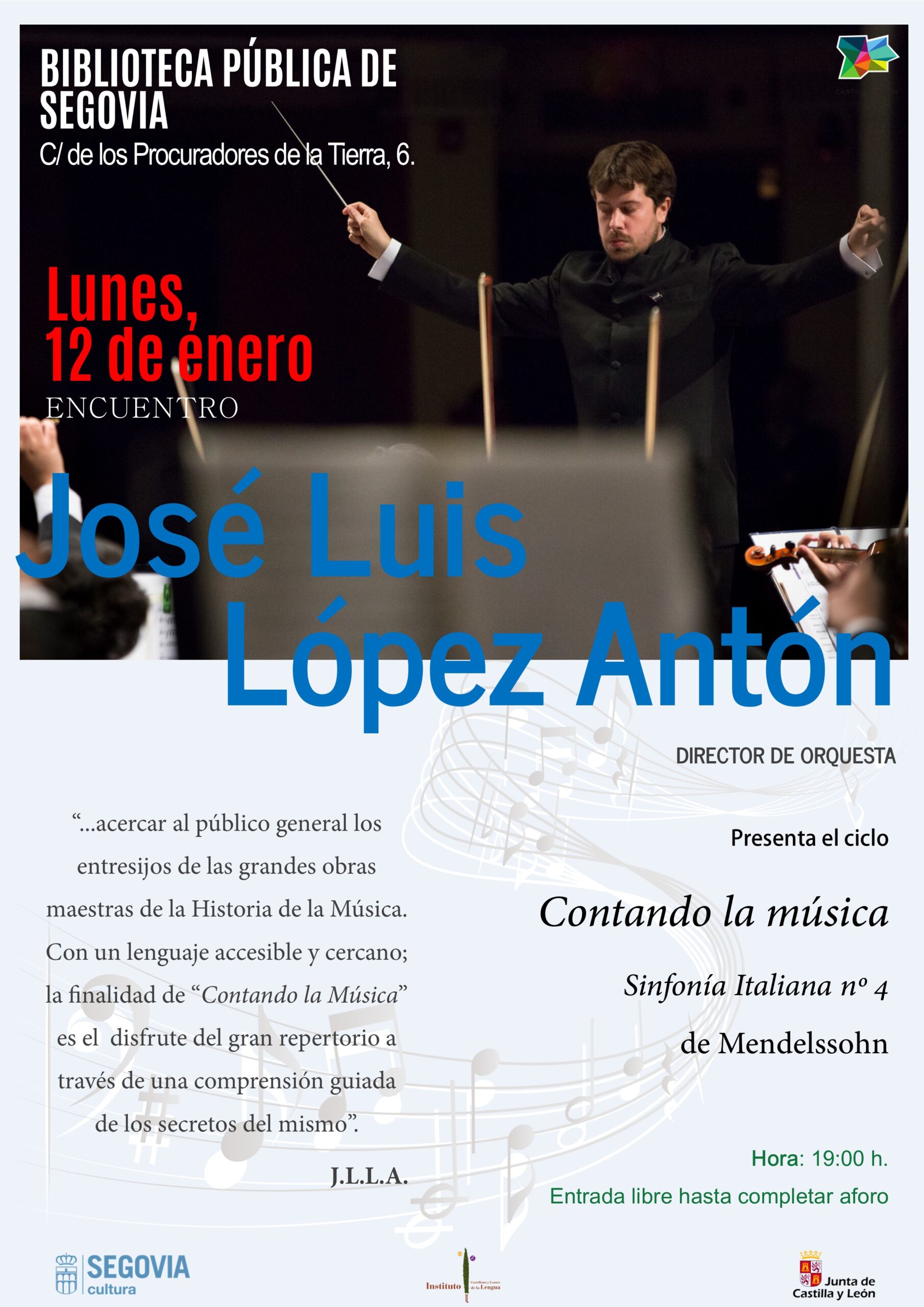 El Instituto Castellano y Leonés de la Lengua y el Ayuntamiento de Segovia organizan el lunes, 12 de de enero, a las 19:00 horas, en la Biblioteca Pública de Segovia, una nueva sesión del ciclo divulgativo de música clásica ‘Contando la música’, la charla de apreciación musical impartida por José Luis López Antón, director titular de la Orquesta Sinfónica de Ávila. En este nuevo encuentro con el público, López Antón analiza la partitura de la Sinfonía Italiana nº 4 de Mendelssohn.