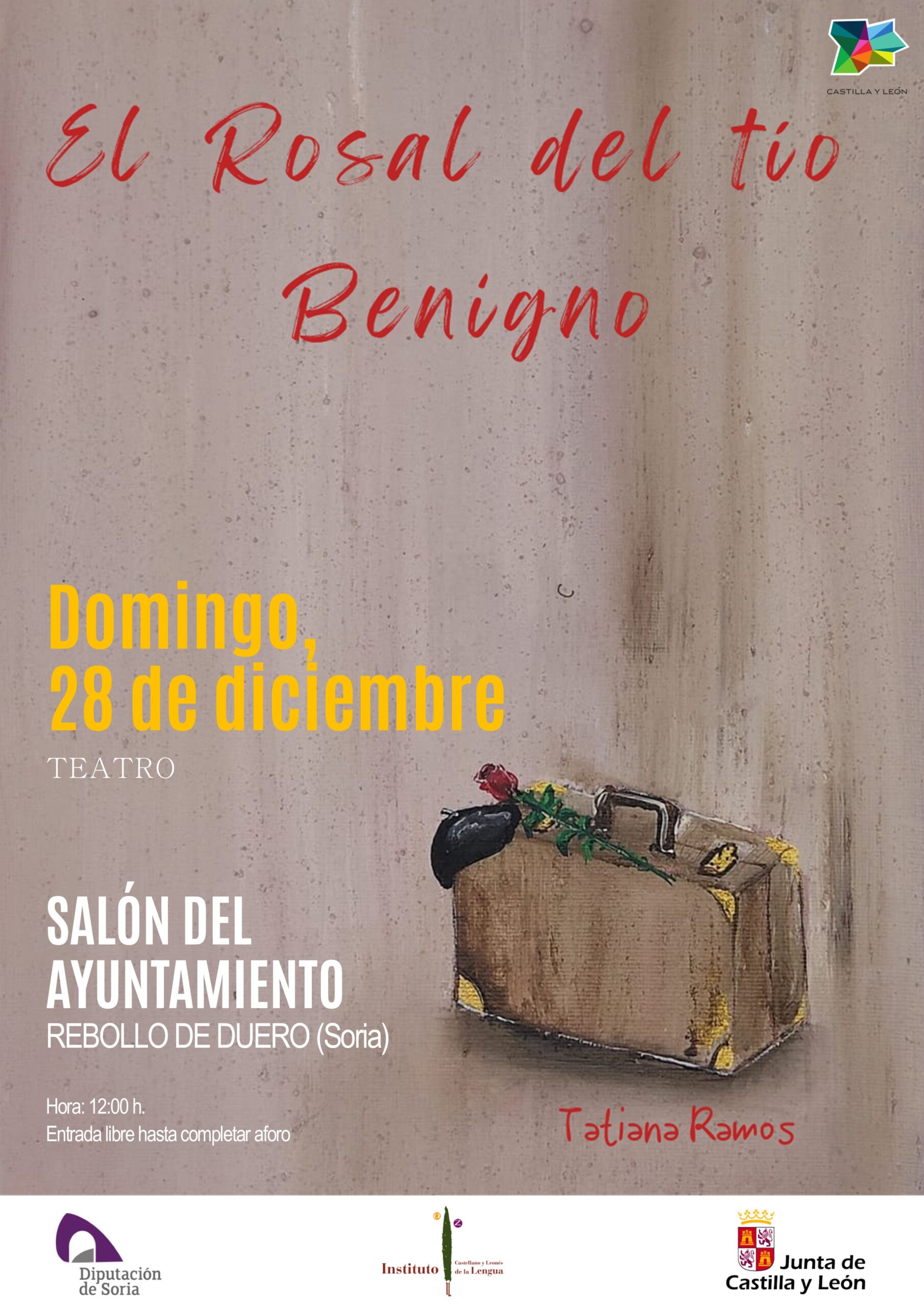 El Instituto Castellano y Leonés de la Lengua y la Diputación de Soria programan el domingo, 28 de diciembre, a las 12:00 horas, en el pequeño municipio soriano de Rebollo de Duero, la propuesta de microteatro ‘El rosal del tío Benigno’, puesta en escena de la compañía ‘Pasito a paso’, de la actriz soriana Tatiana Ramos. Se trata de un espectáculo que pretende servir de homenaje a las generaciones que sobrevivieron y viven en el medio rural, prestando atención a los recuerdos de una niñez pasada muchas veces entre gallinas, rebaños y huertos.