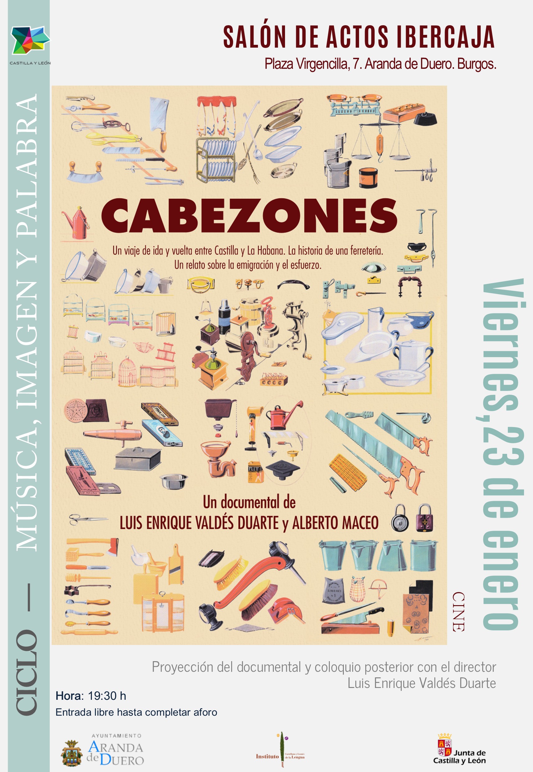 El Ayuntamiento de Aranda de Duero y el Instituto Castellano y Leonés de la Lengua organizan el viernes, 23 de enero, a las 19:30 horas, en el salón de actos Ibercaja, la proyección del cortometraje documental ‘Cabezones’, original del escritor y dramaturgo Luis Enrique Valdés y del actor Alberto Maceo, cubanos exiliados en España y Alemania, respectivamente. ‘Cabezones’ documenta el viaje de ida y vuelta emprendido por el vallisoletano Nicolás Cabezón, fundador de la ferretería más famosa de La Habana, ‘Cabezón y Feíto’. La proyección continúa con un coloquio dirigido por el director del documental, Luis Enrique Valdés. La propuesta se integra en el ciclo cultural ‘Música, Imagen y Palabra’.